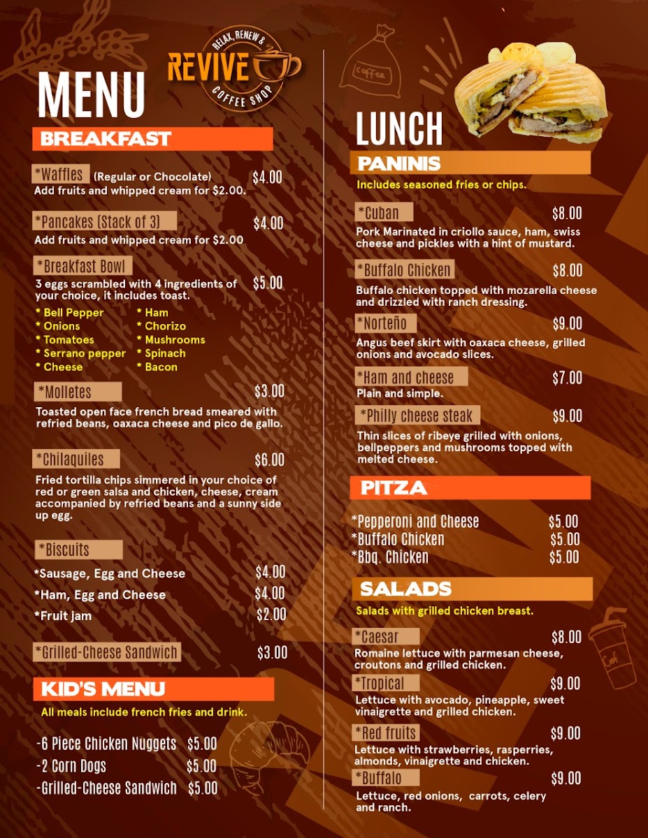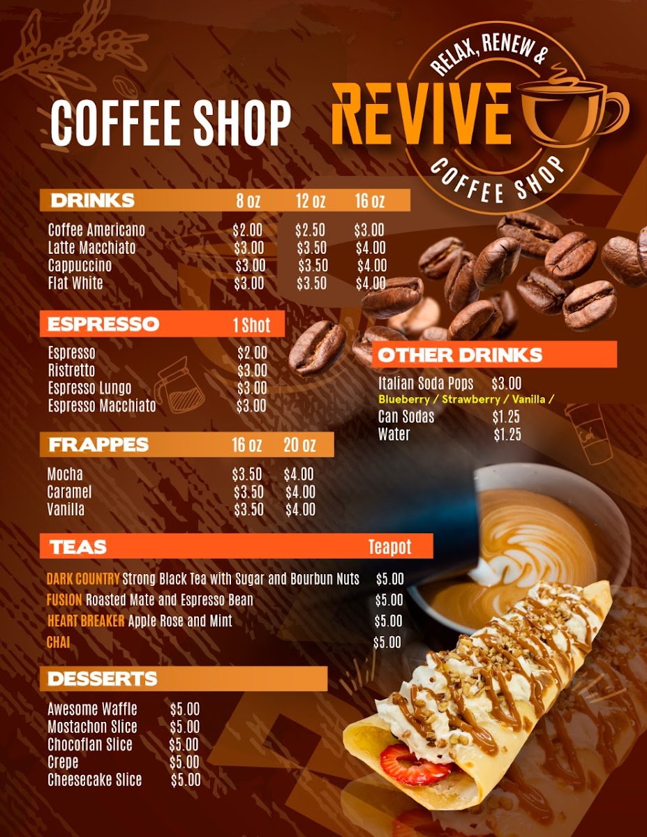 Overall, the menu at Revive Coffee Shop feels thoughtfully curated, offering a balanced mix of classic café staples and indulgent treats. Their coffee selection covers all the essentials, from a smooth Americano and creamy Latte Macchiato to a rich Cappuccino and well-crafted Flat White, while espresso lovers can enjoy options like Espresso, Ristretto, Espresso Lungo, and Espresso Macchiato. For something sweeter, the frappes-Mocha, Caramel, and Vanilla-add a refreshing twist, pairing perfectly with desserts such as the Awesome Waffle, Mostachon Slice, Chocoflan Slice, Crepe, and Cheesecake Slice. Tea drinkers aren’t left out either, with unique blends like Dark Country Strong Black Tea With Sugar And Bourbon Nuts, Heart Breaker Apple Rose And Mint, and Chai. Beyond that, the inclusion of Italian Soda Pops, Can Sodas, and Water ensures there’s something for everyone, while the kid-friendly options-6 Piece Chicken Nuggets, 2 Corn Dogs, and a Grilled-Cheese Sandwich-make it a welcoming spot for families. Even without listed prices, the variety and appeal of the menu leave a strong impression of a cozy, versatile café experience.